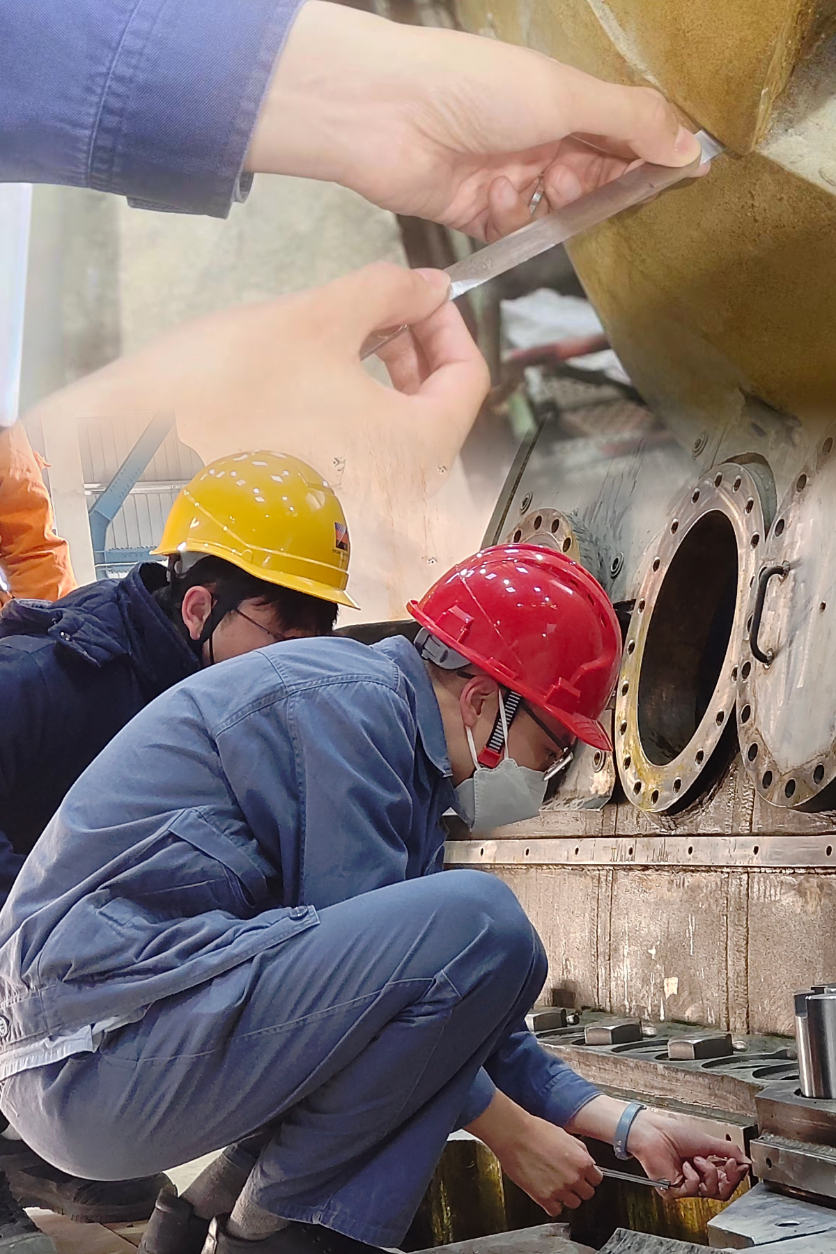 “小陳,你看,檢測校驗電量變送器是這樣操作的。”劉明師傅正手把手教新員工陳展遠學習電氣維護的檢驗測定工作。恰逢燃氣熱電2號機組B修,小陳和另外8位新員工便有了這次寶貴的機會現場跟訓,在實踐中提高檢修能力。自維護部2024年青工培訓專項計劃實施以來,9名新員工迅速投入到緊張的學習中,從集中認知培訓到檢修實踐,都安排了不同的師傅陪伴和指導。“剛步入新的工作崗位,有經驗豐富的師傅帶著,使我增添了前進的動力。”