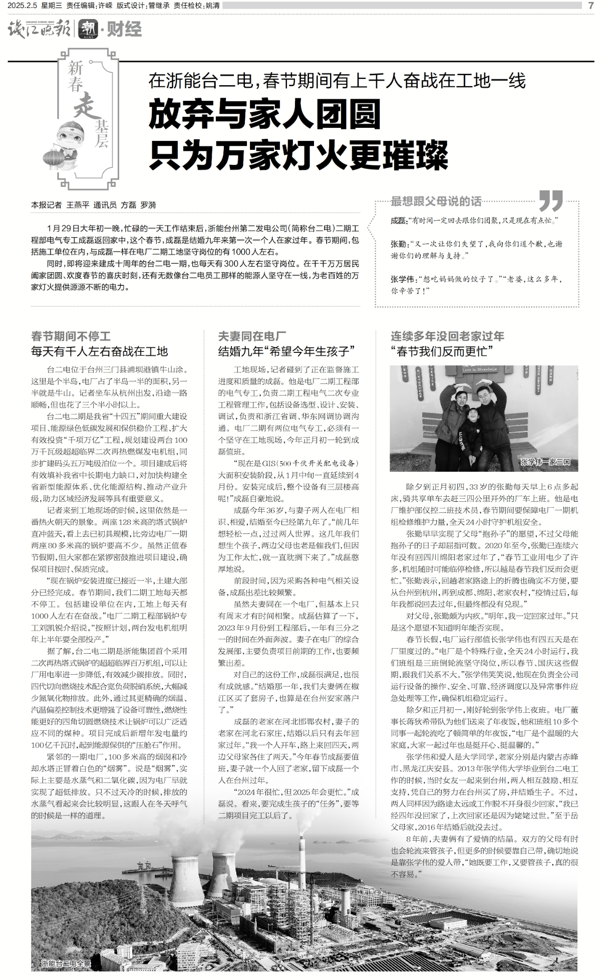 2月5日,錢江晚報(bào)整版報(bào)道《在浙能臺二電,春節(jié)期間有上千人奮戰(zhàn)在工地一線 放棄與家人團(tuán)圓 只為萬家燈火更璀璨》。 錢江晚報(bào) 圖