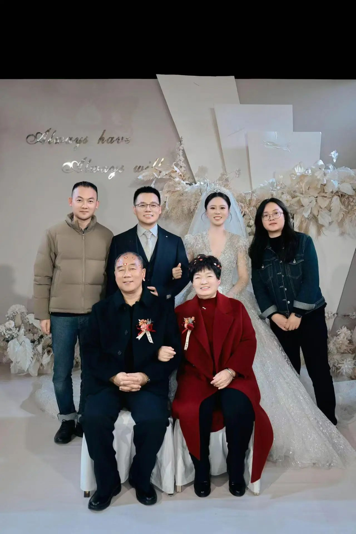 成磊(左一)一家合影。哥哥(左二)去年11月結(jié)婚,右一為成磊妻子。 臺二電 提供