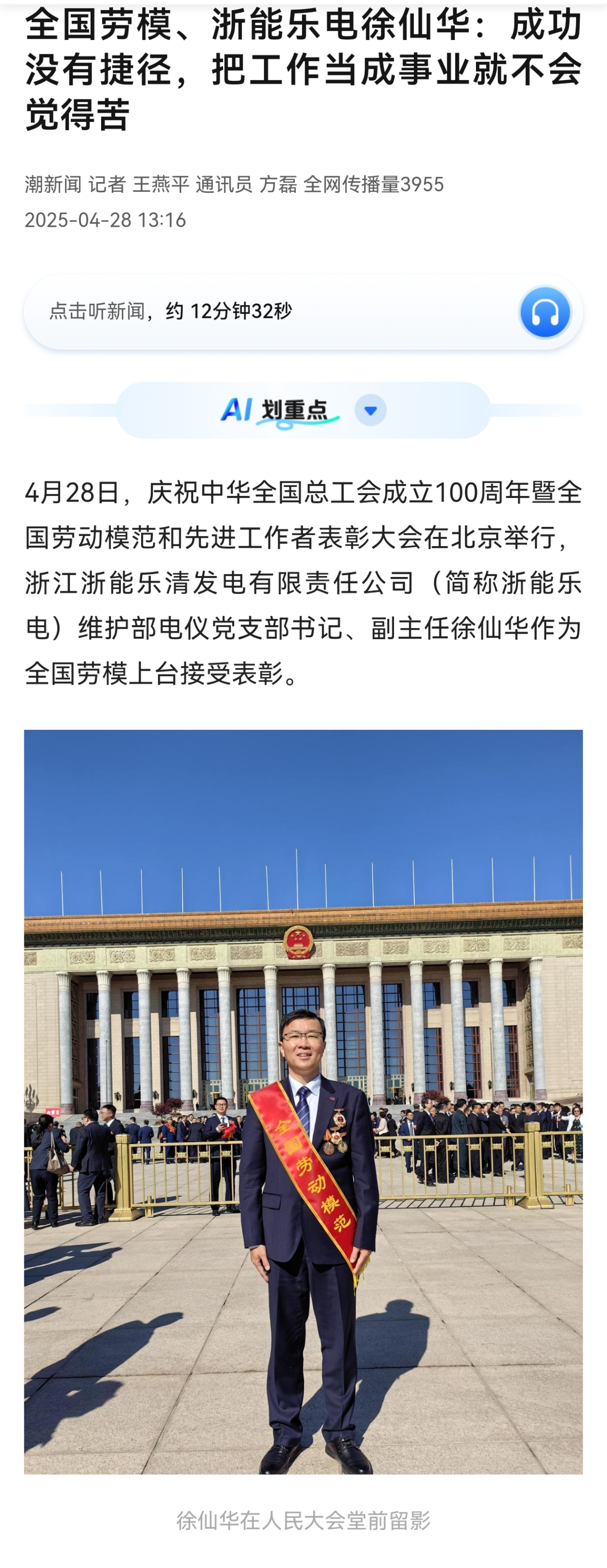 編者按:4月28日,慶祝中華全國總工會成立100周年暨全國勞動模范和先進工作者表彰大會在北京舉行,浙能集團所屬浙江浙能樂清發電有限責任公司維護部電儀黨支部書記、副主任徐仙華作為全國勞模接受表彰。新華社、浙江衛視、錢江晚報、潮新聞、中國電力報、中國能源網等多平臺聚焦徐仙華同志多年扎根一線奮斗事跡。