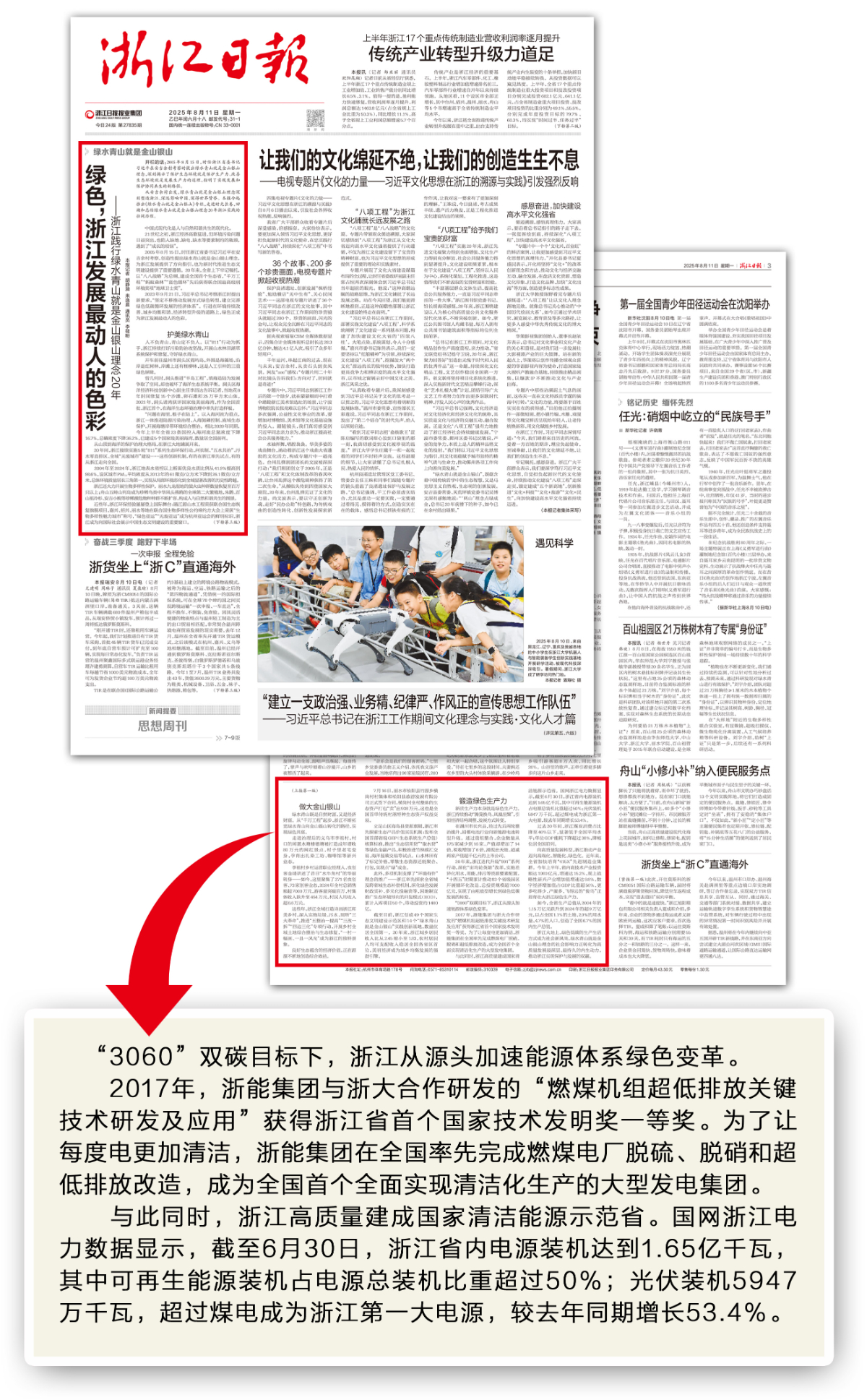 此前8月11日,《浙江日報》頭版頭條刊發綜述稿《綠色,浙江發展最動人的色彩——浙江踐行綠水青山就是金山銀山理念20年》,浙能集團入列其中。 浙江日報 提供
