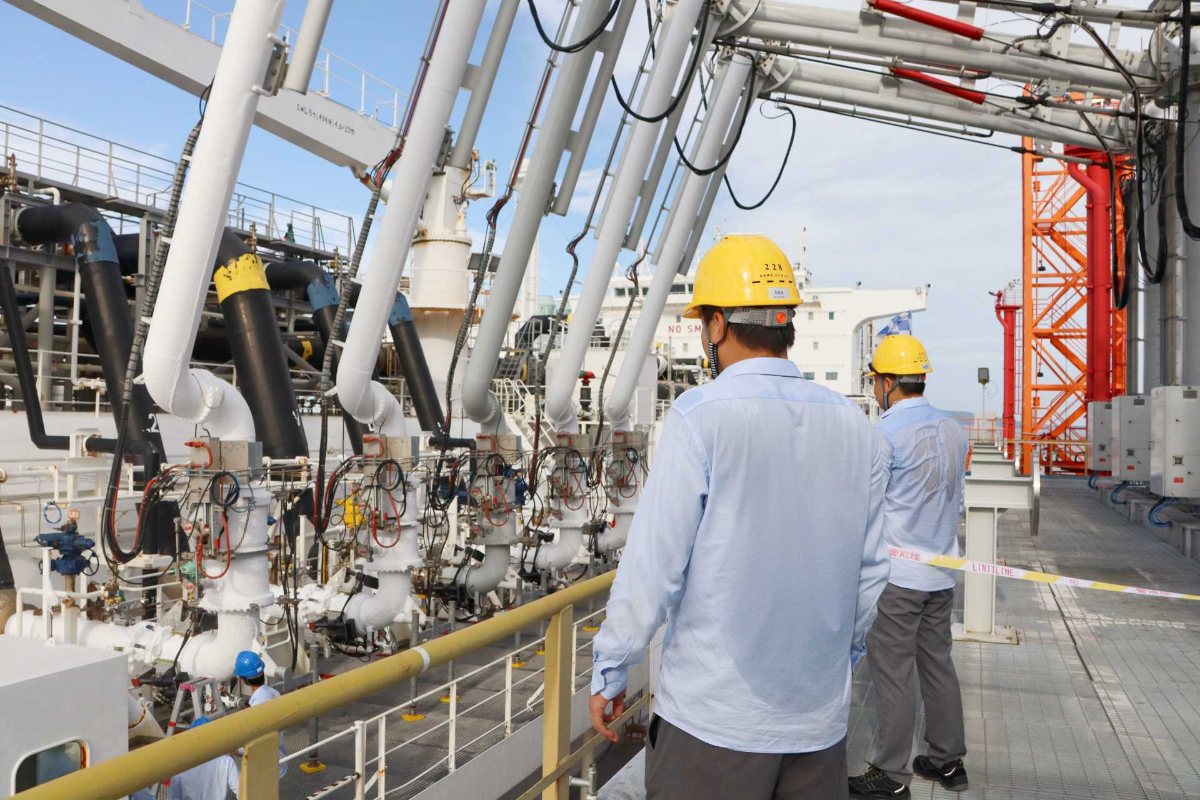 烈日下,溫州LNG公司操作監督組成員為接船作業提供岸上協作與監護支持。 謝晨瀅 攝