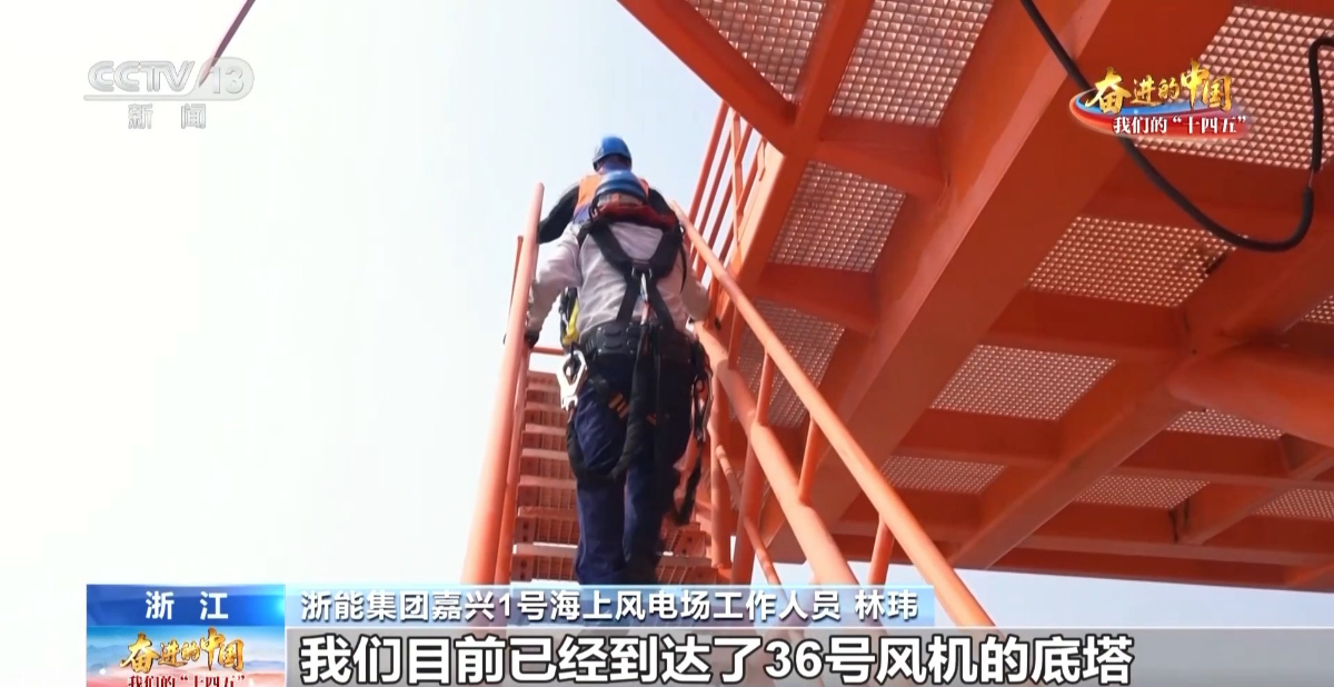 中央電視臺(tái)新聞?lì)l道《奮進(jìn)的中國(guó) 我們的“十四五”》報(bào)道嘉興1號(hào)海上風(fēng)電場(chǎng)風(fēng)機(jī)維護(hù)人員的一天。 周晨 提供
