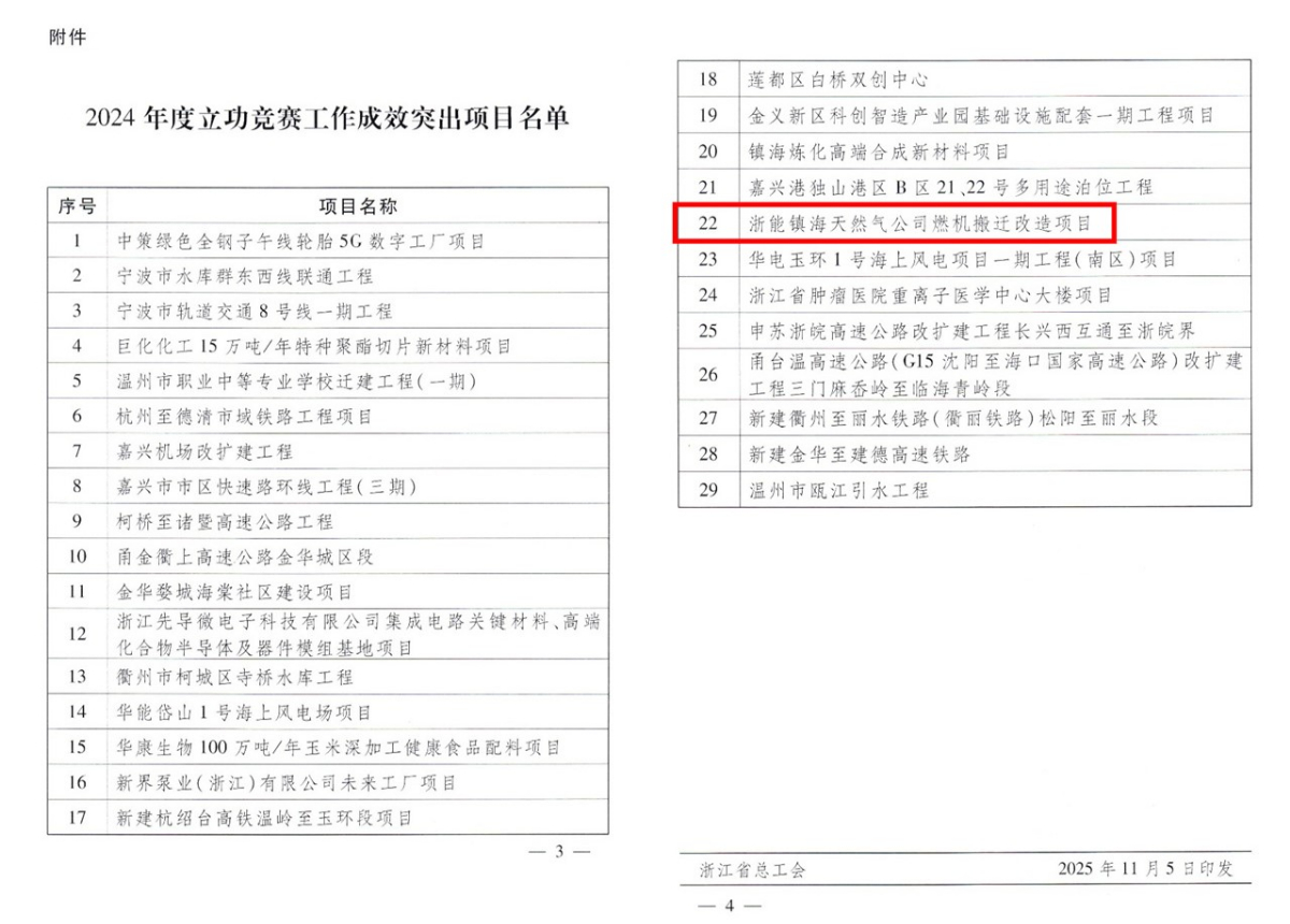 浙能鎮電燃機搬遷改造項目獲省級立功競賽工作成效突出項目