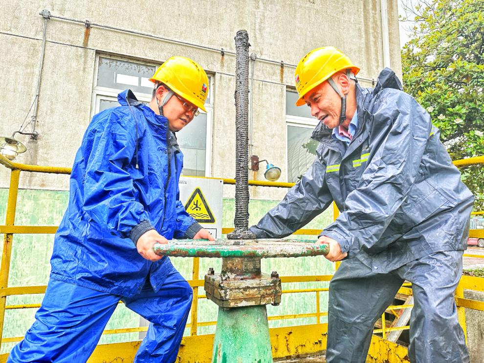 2025年臺風來襲時,浙能長電黨員沖鋒在前,冒雨操作雨水泵房前池隔離閥。 朱海 攝
