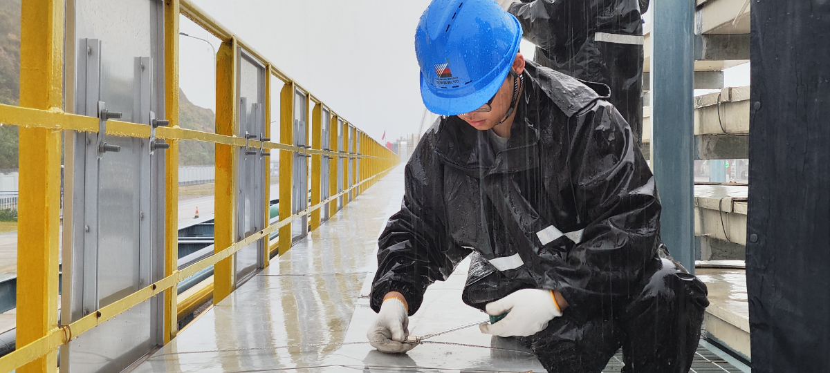 臺風來臨前,溫州LNG公司青年突擊隊隊員冒雨沖鋒,扎實開展電纜橋架蓋板緊固工作。 謝晨瀅 攝