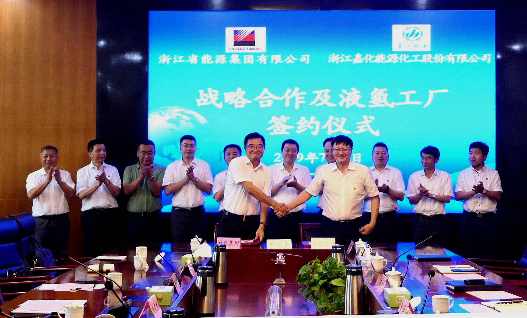 浙能集團黨委委員、副總經理趙建林,嘉化能源董事長管建忠,嘉興港區黨工委書記戴鋒,黨工委副書記、管委會主任石云良等出席簽約儀式并講話,浙能集團氫能技術引進與應用辦公室主任王惠挺、嘉化能源總經理汪建平代表雙方在合作協議上簽字。