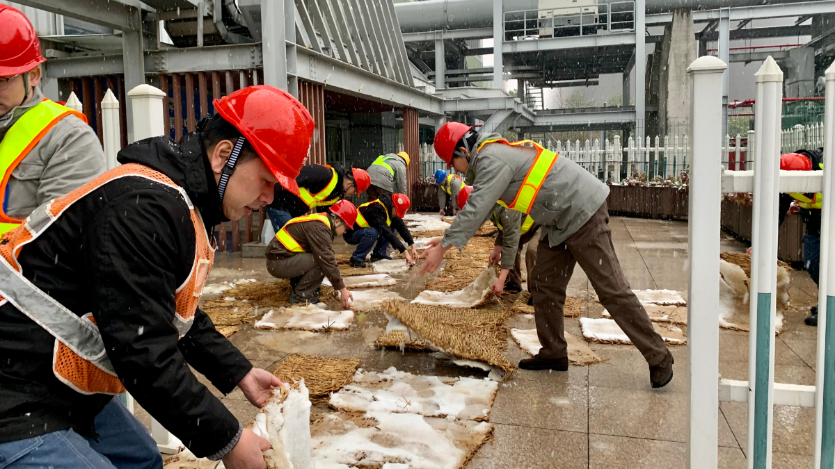 12月18日下午,浙能長興發電公司燃機項目部黨員志愿者冒著風雪在廠區主干道鋪設防滑草墊,保障生產安全。 位亞飛 攝