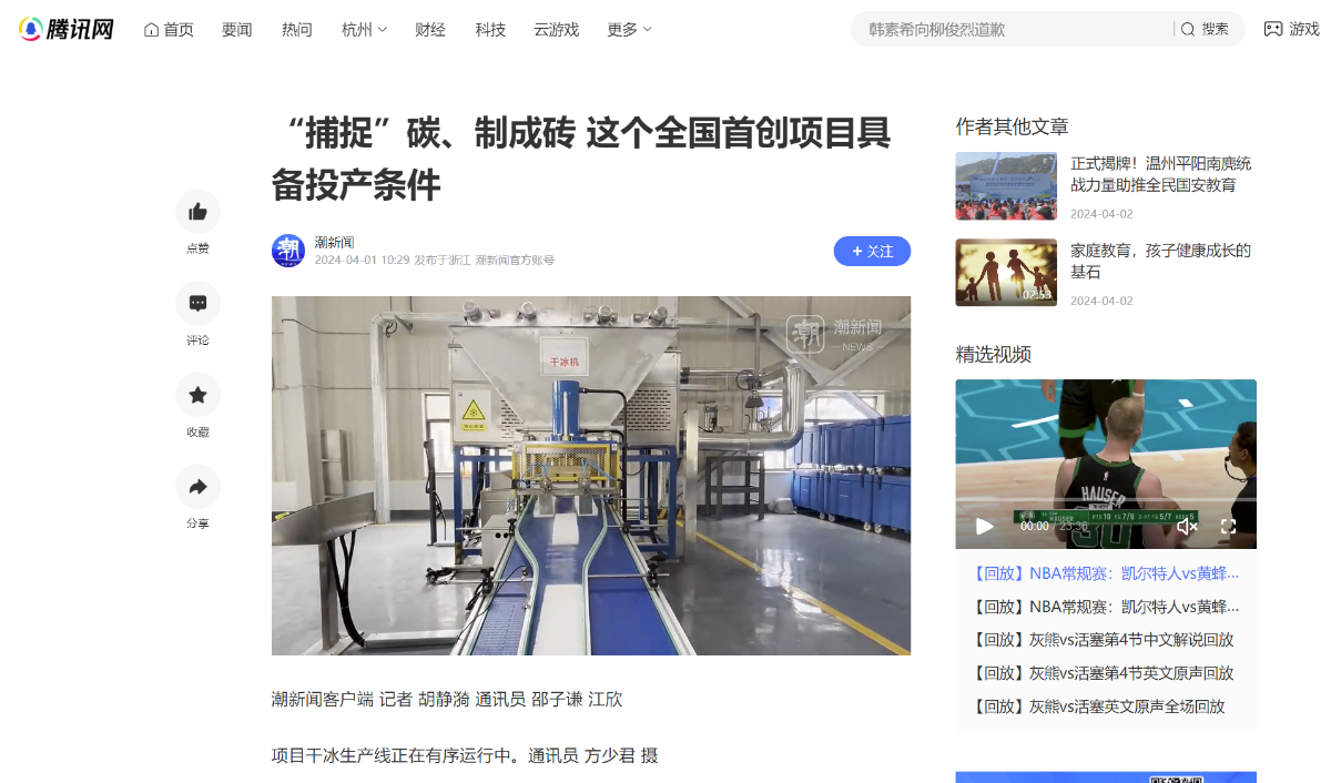 4月1日,騰訊網轉載報道《“捕捉”碳、制成磚 這個全國首創項目具備投產條件》。 騰訊網 圖