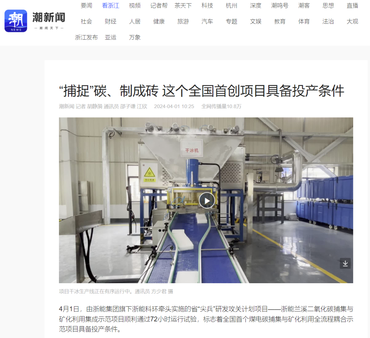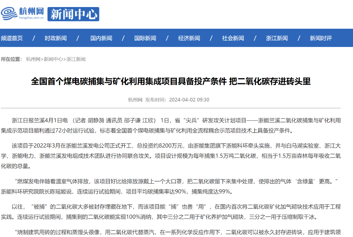 4月2日,浙江在線報道《全國首個煤電碳捕集與礦化利用集成項目具備投產條件 把二氧化碳存進磚頭里》。 浙江在線 圖