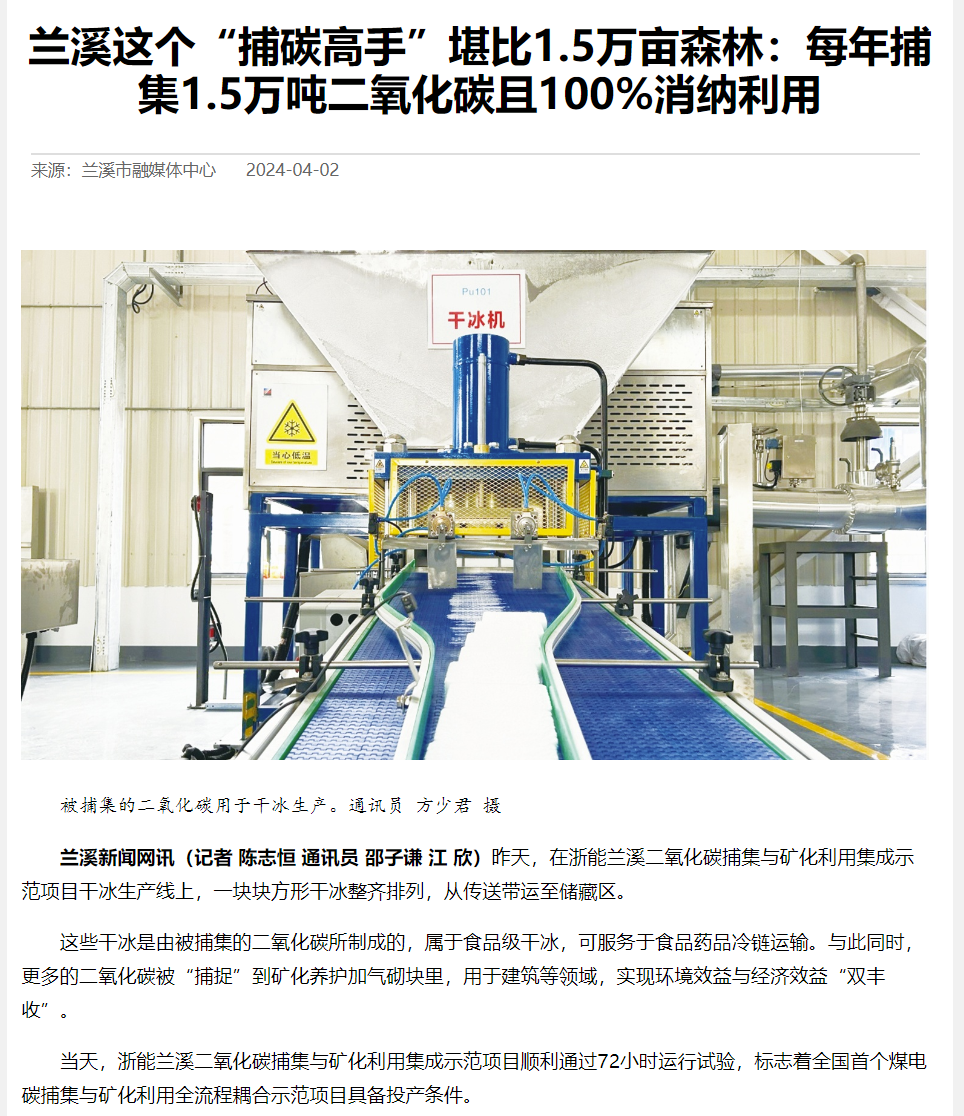 4月1日,蘭溪新聞網報道《蘭溪這個“捕碳高手”堪比1.5萬畝森林:每年捕集1.5萬噸二氧化碳且100%消納利用》。 蘭溪新聞網 圖