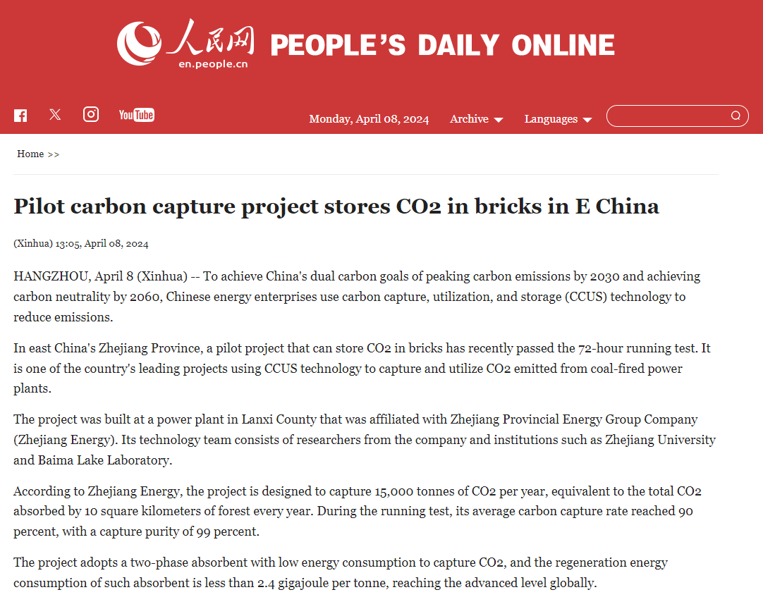 4月8日,人民日報旗下人民網英文版報道《Pilot carbon capture project stores CO2 in bricks in E China》。 人民網英文版 圖
