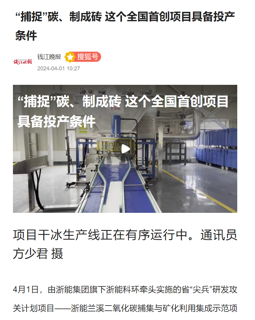 4月1日,錢江晚報搜狐號轉載報道《“捕捉”碳、制成磚 這個全國首創項目具備投產條件》。 錢江晚報搜狐號 圖