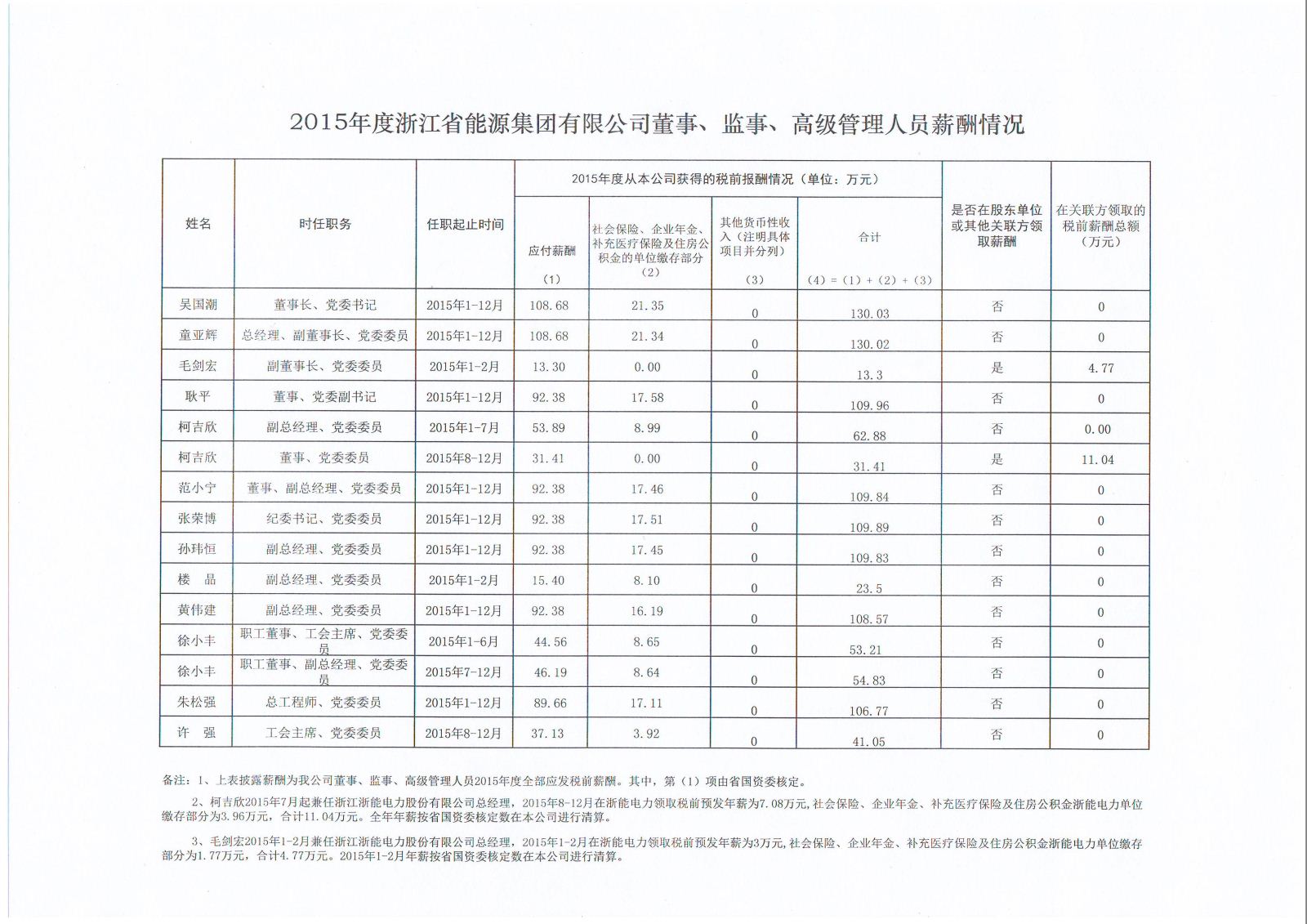 浙能集團2015年度董事、監(jiān)事、高級管理人員薪酬情況
